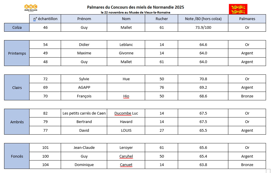 Les miels sélectionnés au niveau départemental ont ensuite été présentés au jury régional, réuni le samedi 22 novembre 2025 à Vieux-la-Romaine (Calvados).